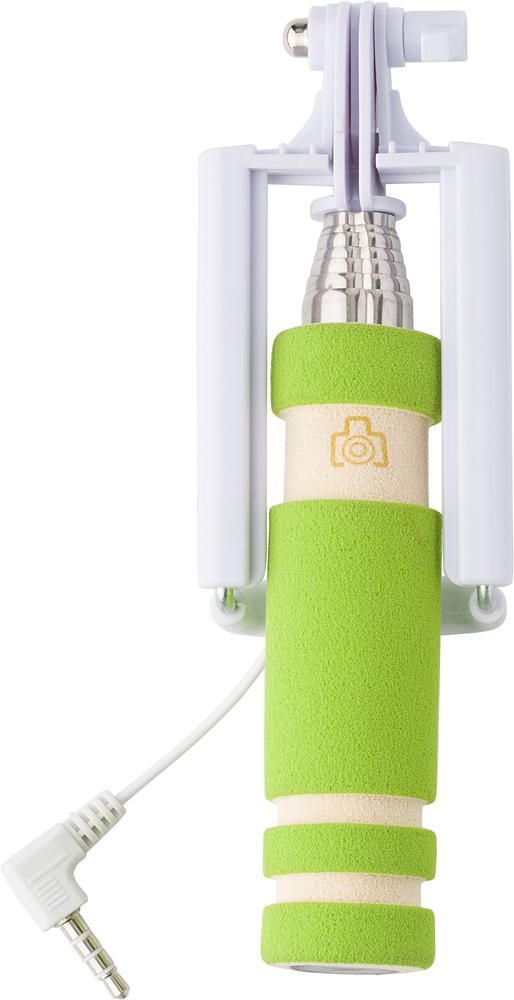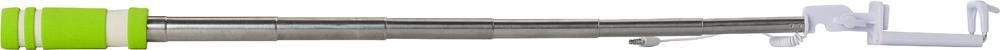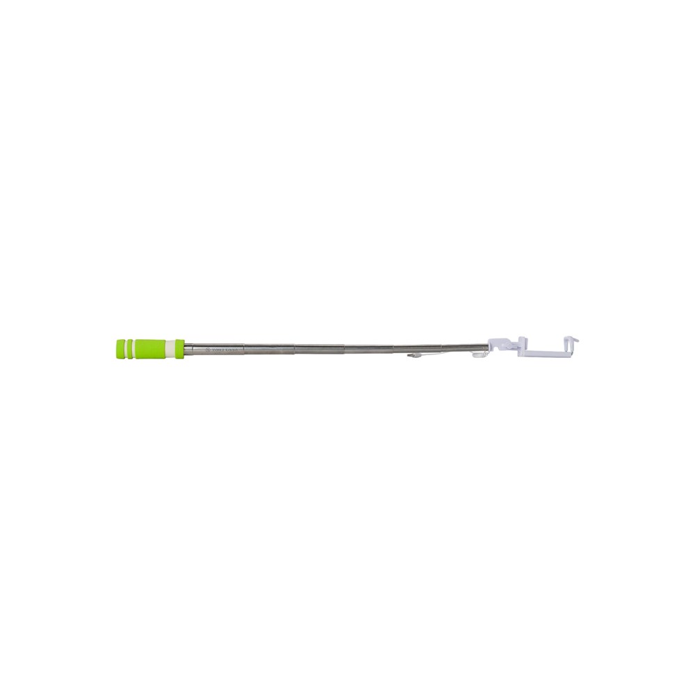 Kunststof telescopische selfie stick, te verlengen tot maximaal 61 cm. Het handvat van EVA schuim bevat een drukknop. De telefoonhouder bevat een verbindingskabel, ongeveer 33 cm lang.