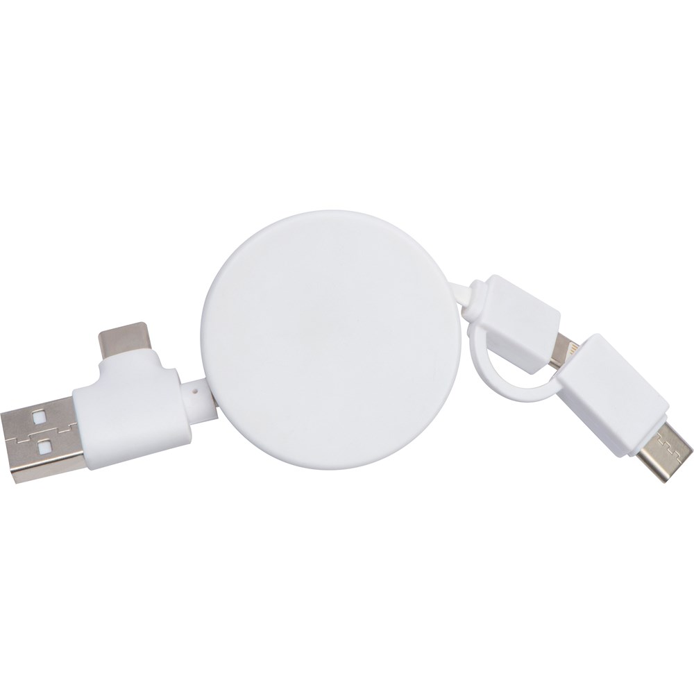 Verlengbare oplaadkabel in een kunststof behuizing met een bamboe plaat, USB, 2 USB-C types en een iOS adapter. Wij graveren uw reclame op het bamboe gedeelte. Door de natuurlijke bamboenerf is elk item en elke gravure uniek.