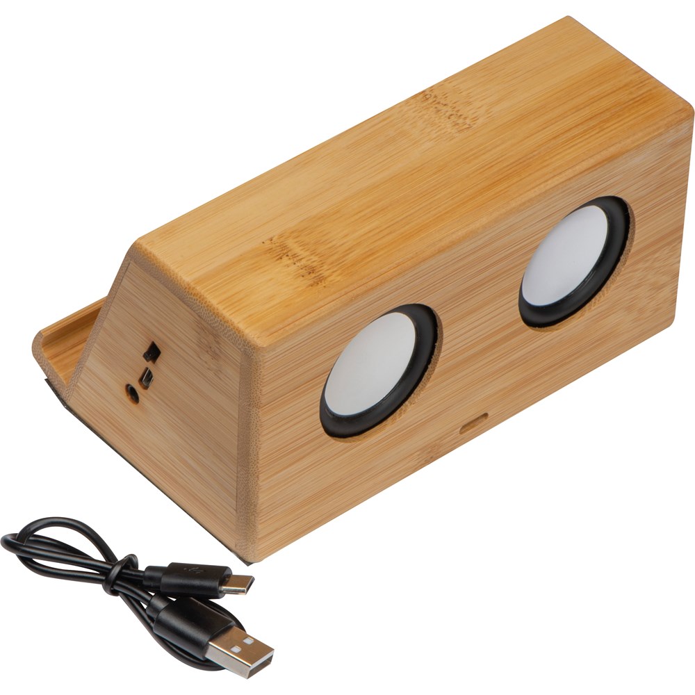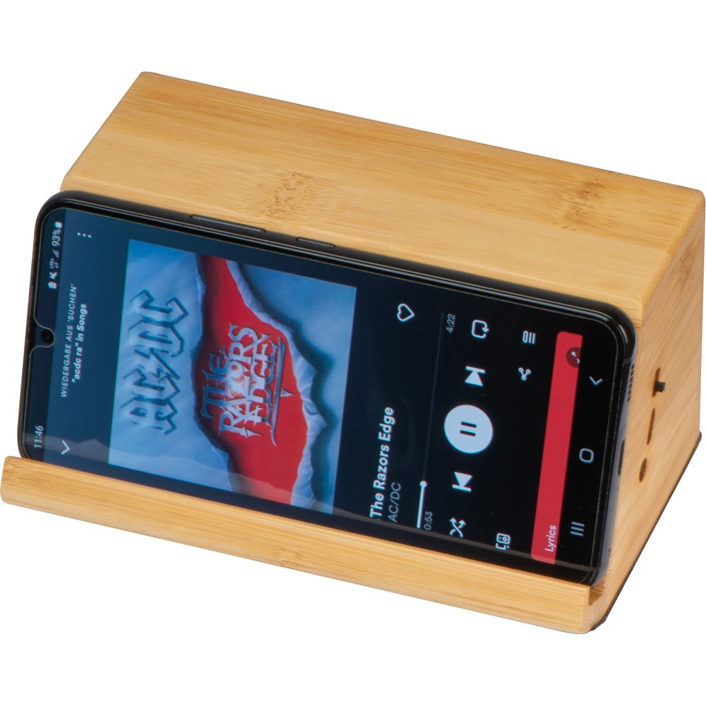 Bamboe speaker met 1.200 mAh accu, oplaadkabel en inductielaadfunctie aan de voorzijde. Voor alle QI-compatibele smartphones. Uw reclame wordt op de speaker gegraveerd. Door de natuurlijke bamboenerf is elk item en elke gravure uniek.