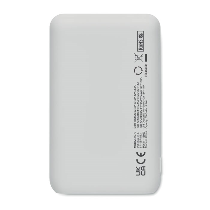 Powerbank 5000 mAh in gerecycled ABS. Geschikt voor smartphones, Uitgangsstroom DC5V/2A 2x type A en 1x type C in/uit en 1x type micro-B ingang.