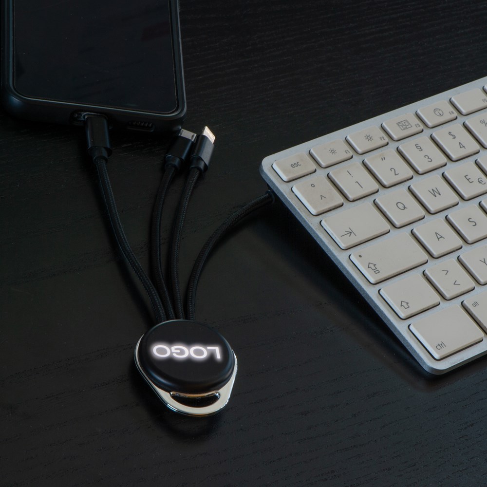 Kabelset met USB-A, USB-C, Micro-USB en Lightning aansluiting. Praktische hulp in alle situaties. In de toekomst kunnen meerdere apparaten tegelijkertijd worden opgeladen. Het bijzondere hoogtepunt hier is het licht in het hoofdbord. Uw lasergegraveerde reclame wordt verlicht wanneer de kabelset bijvoorbeeld op uw laptop wordt aangesloten.