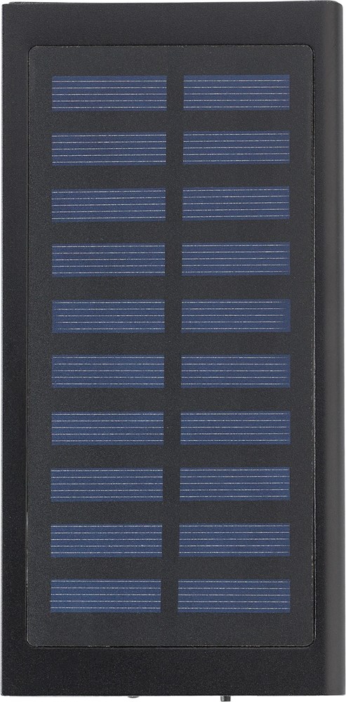 ABS en aluminium zonne-energie powerbank, 8.000 mAh. Input DC5V/1A. Output data: DC5V / 1A and DC5V / 2.1A. Met USB aansluiting en laadkabel (USB – micro USB).