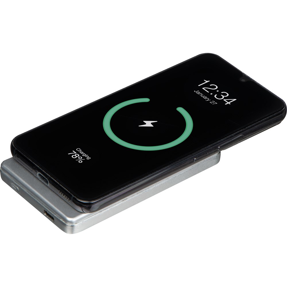 Magsafe® 5.000 mAh van gerecyceld aluminium voor draadloos opladen tot 10 Watt. Door de geïntegreerde magneten klikt dit apparaat aan uw IPhone en zorgt voor snel en draadloos opladen. Compatible vanaf IPhone 12. Voor andere QI-geschikte modellen kan het als een draadloos laadstation gebruikt worden. Uw logo wordt op de achterzijde gegraveerd.