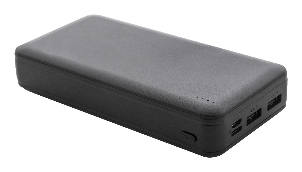 Gerecycleerde ABS-krachtbank met batterij van 20.000 mAh. Met 2 USB - en 1 USB-C-opladerpoorten. Micro USB en USB-C ingangspoorten. Inclusief USB lader kabel.