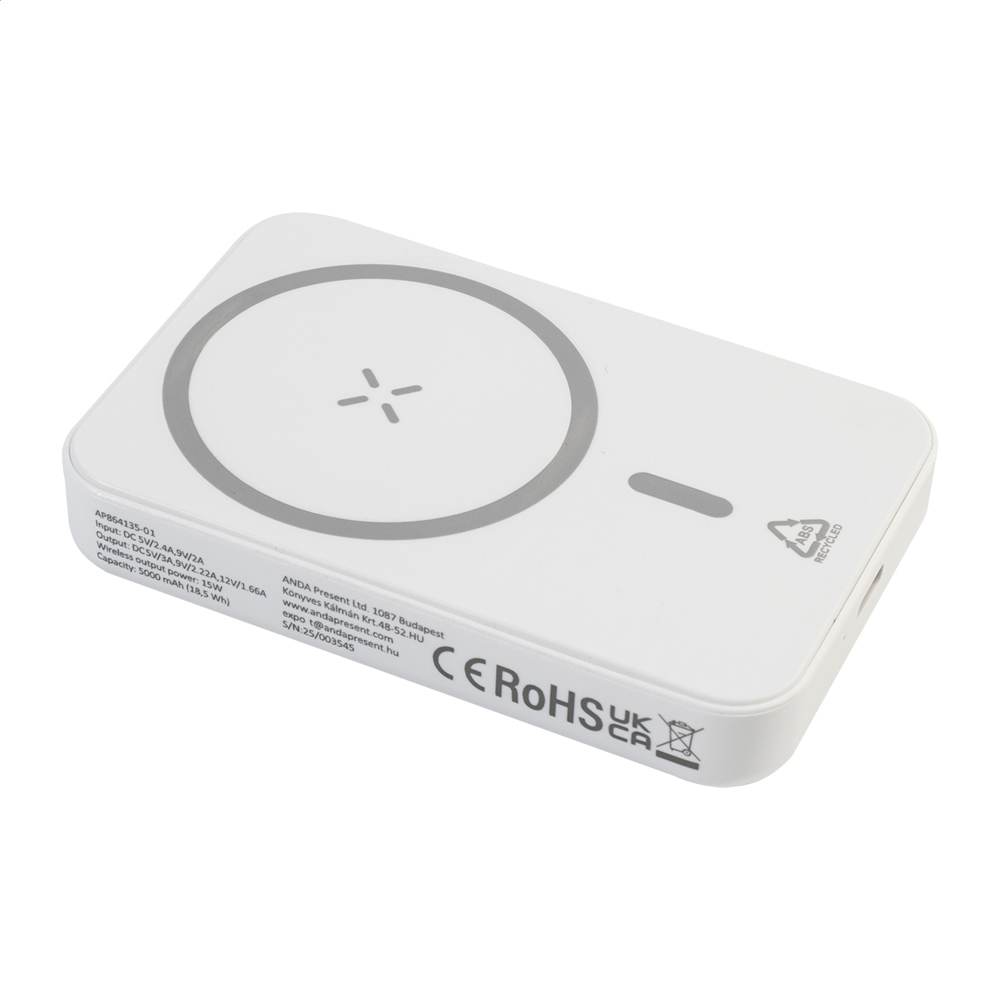 Gerecycleerde ABS powerbank met 5000 mAh batterij en ingebouwde magnetische draadloze snellader...meer