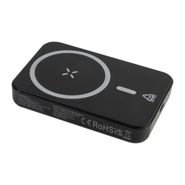 Gerecycleerde ABS powerbank met 5000 mAh batterij en ingebouwde magnetische draadloze snellader (15W). Met USB-C ingang en oplader poort. Inclusief zelfklevende metalen ring om de magnetische functie op elk draadloos oplaadbaar apparaat te gebruiken. Compatibel met iPhone® 12 of nieuwer. Inclusief USB lader kabel.
