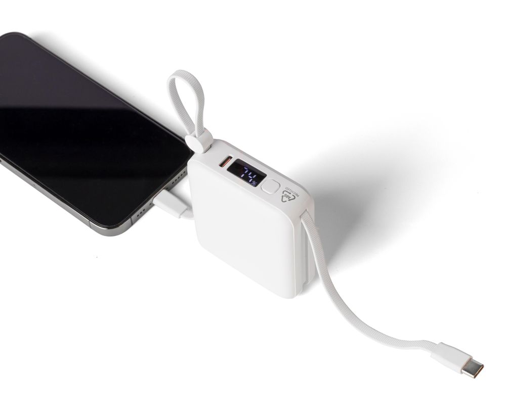 Gerecyclede ABS-powerbank met 10.000?mAh Li-ion batterij en 22,5W snellaaduitgang. Voorzien van een geïntegreerd TPE-draagkoord dat ook dienst doet als oplaadkabel met Lightning- en Type-C-connectoren. Uitgerust met een digitale LED-display bovenop voor het weergeven van de batterijcapaciteit. Inclusief Type-C in-/uitgang en Type-A ingang. Biedt bescherming tegen oververhitting, kortsluiting, overspanning en overstroom. Voorzien van label met gerecycleerd ABS-logo op de achterzijde. Individueel verpakt in een bruine kartonnen doos met zijdepapier aan de binnenzijde.