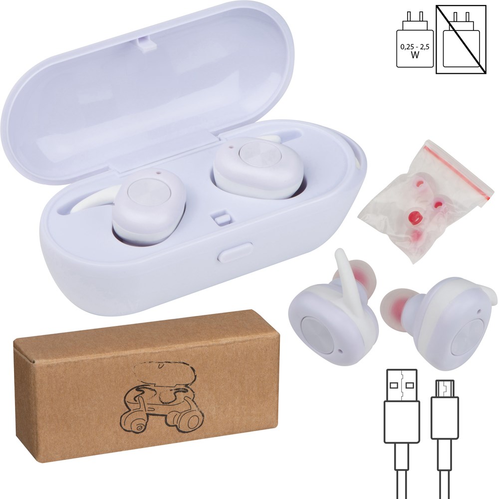 Ergonomische in-ear bluetooth koptelefoon met USB oplaadkabel en laadstation, die tevens als verpakking dient. Speeltijd ca 2-3 uur, oplaadtijd ca 1 uur en 35 mAh accu. Uw reclame wordt op de box gedrukt